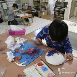 またアトリエでは点数も評価もありません。なぜなら他と比較するのではなく、一人ひとりの個性的な表現をじっくり育てていきたいから。もちろんクラスのチャイルドアートカウンセラーは子どもたちに求められたときは一緒に考えたりなど十分に助言や手助けをします。
